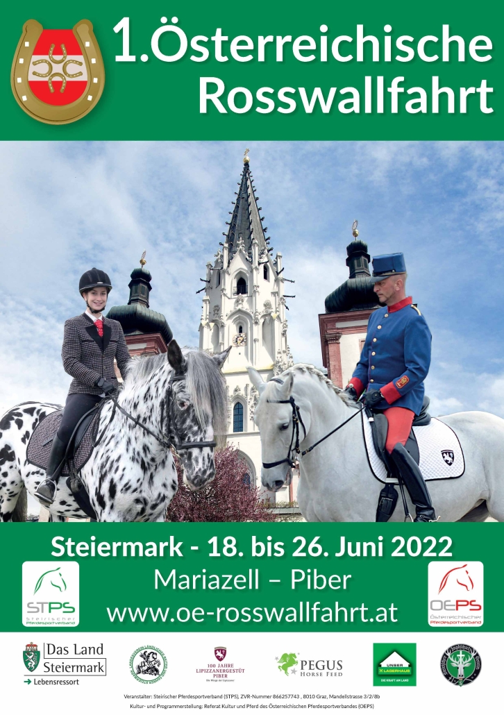 Die 1. Österreichische Rosswallfahrt führt die Pferdefreunde von 18.-26. Juni 2022 auf der Strecke Mariazell – Niederalpl – Turnau – Thörl – Oberort (Tragöß) – Maria Freienstein – St. Michael – St. Stefan ob Leoben – Maria Schnee auf der Gleinalm – Maria Lankowitz – Piber durch die malerische Landschaft der Steiermark.