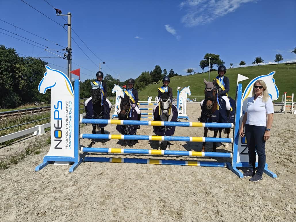 Pferdesport in NÖ | Springen (14.07.2025) – Im Rahmen des zweitägigen Springturnieres im Union Reit- und fahrverein Allhartsberg am 12.-13. Juli wurden die Niederösterreichischen Landesmeisterinnen der Sparte Springen Pony ermittelt. Die Goldmedaillen und Schärpen gingen mit Ayleen Kraml (C-Pony), Miriam Wansch (Kleinpony), Antonia Cholewa (Kinder) und Christiane Pietsch (Jugend) an Reiterinnen vom Pferdesport Team SL, dem Team Semper Salio sowie dem LRFV MRG Gleißenfeld.