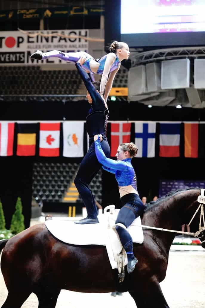 Pferdesport in NÖ | Voltigieren (19.07.2024) – An Wettkampftag 3 beim Multi-Championat der Voltigierer in der PostFinance Arena in Bern (SUI) fielen an Tag 3 (Freitag, 19.7.2024) bereits die ersten Medaillenentscheidungen. Der WM-Titel im Gruppenvoltigieren und der EM-Titel im Junioren Pas de deux wurden vergeben und gingen in beiden Fällen mehr als verdient nach Deutschland. Österreich konnte zwar nicht um die Medaillen mitreden, konnte sich aber im guten Mittelfeld platzieren.
