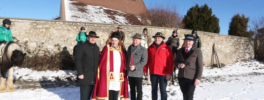 Reiter (im Bild eine kleine Gruppe davon) des Stephani-Ritts 2018 bei der Wallfahrtskirche Schwarzensee, vor (vlnr) Christian Haan (Vizebürgermeister Altenmarkt an der Triesting), Pater Ägidius Metzeler (Wallfahrtsseelsorger Schwarzensee), Peter Gerstner mit Votivkerze (Nationalratsabgeordneter), Norbert Linsbichler (Obmann „Erster Hirtenberger Reit- und Fahrverein“), Otto Kurt Knoll (Bundeskulturreferent Österr. Pferdesportverband). © Referat Kultur und Pferd NOEPS