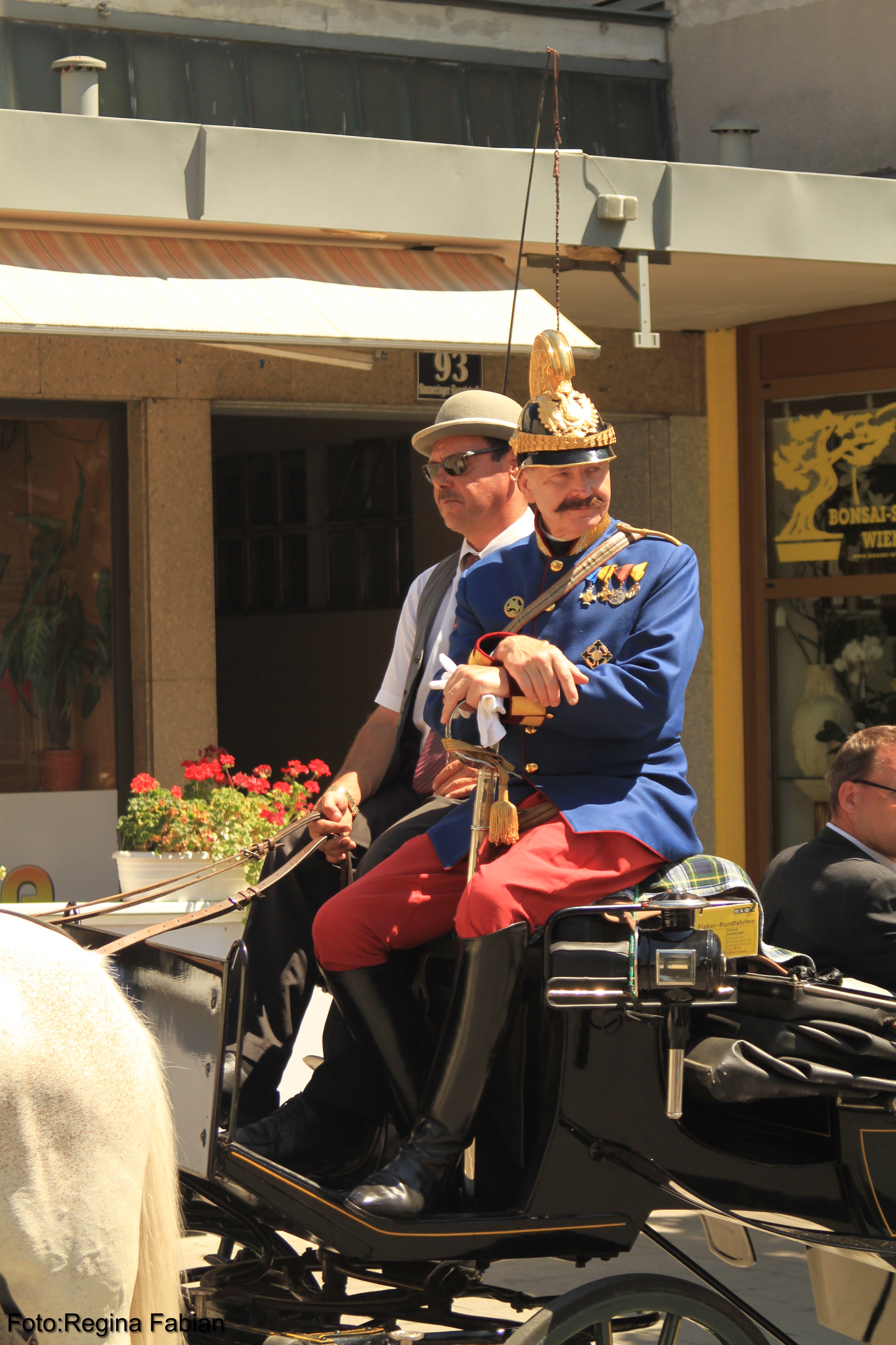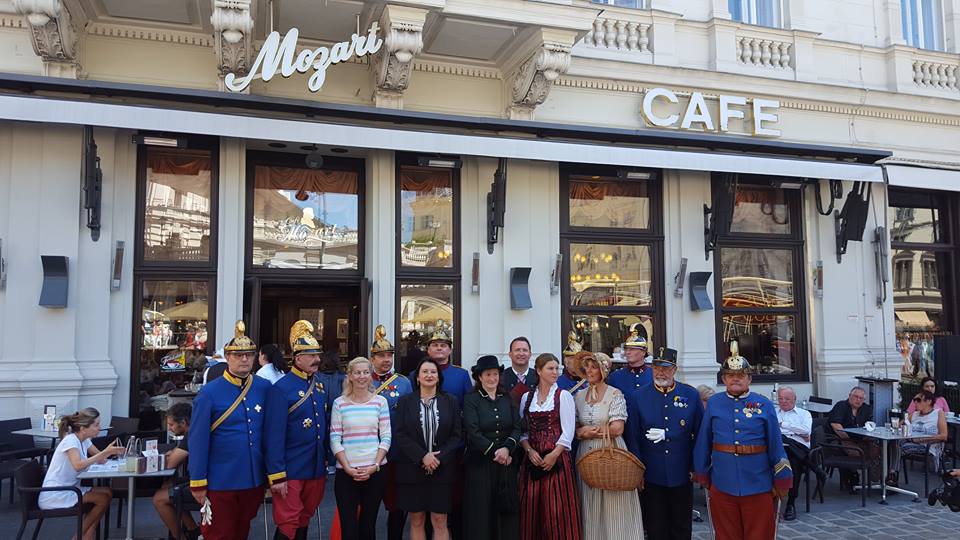 | Schon auf der Simmeringer Hauptstraße und am Schwarzenbergplatz wurden die Kutschen mit den schmucken Uniformen mit Applaus belegt. Vorbei bei der Wiener Staatsoper, beim Hotel Sacher und bei unserem Zielort Cafe Mozart angekommen wurden wir von Fotoaufnahmen belagert.