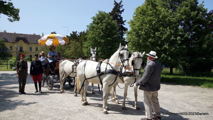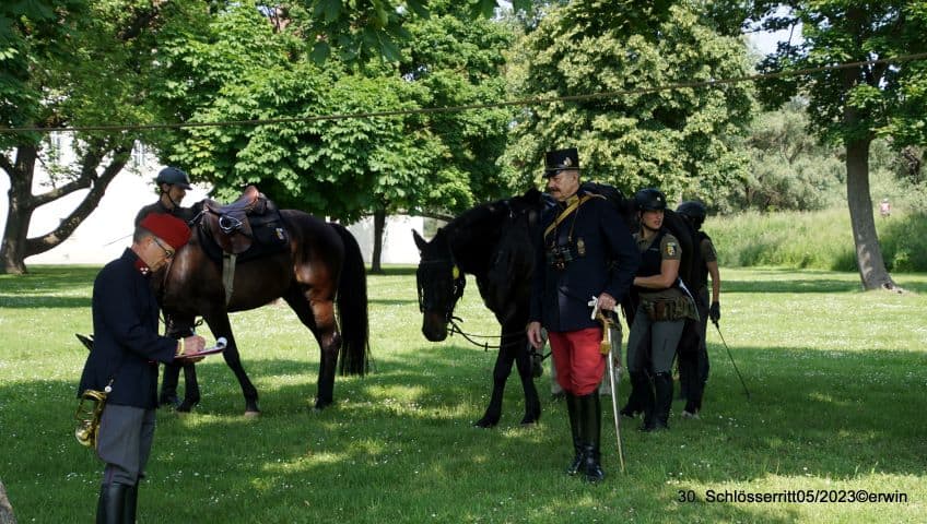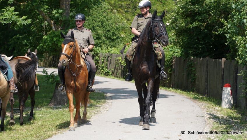 Aus unseren Vereinen (07.08.2023) – Die Reitausbildungseskadron des Dragonerregimentes Nr. 3 im ehem. k.u.k. Militärreit- und Fahrlehrinstitut Schlosshof veranstaltete auch heuer wieder den Marchfelder Schlösserritt (26.-29. Mai 2023) – und das bereits zum 30. Mal! Der Ritt fand unter dem Ehrenschutz des BM f. Landesverteidigung a.D. Dr. Werner Fasslabend und unter der Patronanz von Ungarns Sonderbotschafter Ezh. Georg Habsburg in Zusammenarbeit mit und mit Unterstützung von Mag. Klaus Panholzer, Geschäftsführer der Schloss Schönbrunn Betriebs- und Kulturges.m.b.H, den Bereichsleitern der Eventabteilung, dem Tierbereich Schloss Hof , den Gemeinden, den Bundesforsten und der regionalen Jägerschaft statt.