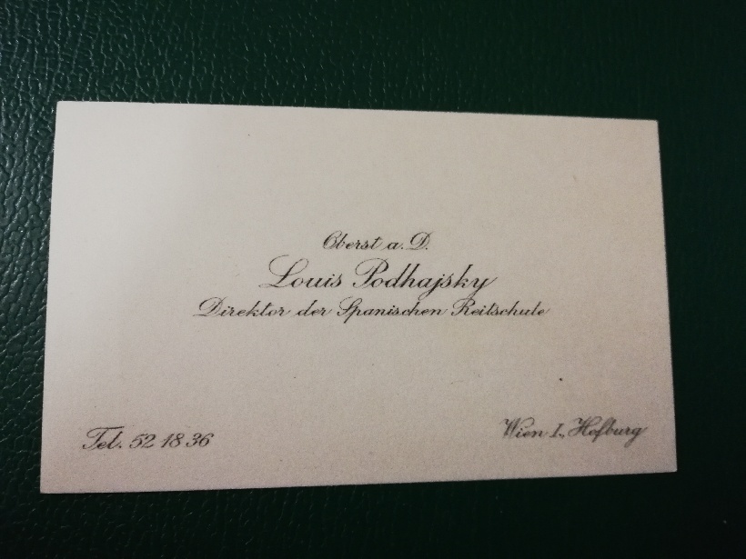 Alois Podhajsky, der legendäre Direktor der Spanischen Hofreitschule, ließ sich mit dem Namenszug „Louis Podhajsky“ seine Visitkarten in der Kunstanstalt für Kupferdruck des heutigen Meisters Wolfgang Schön herstellen. Podhajsky, ein Doyen der Pferdewelt, hat auf höchstem Niveau die Verbindung zwischen Kultur und Pferd gelebt … auch bei seinen Visitkarten.