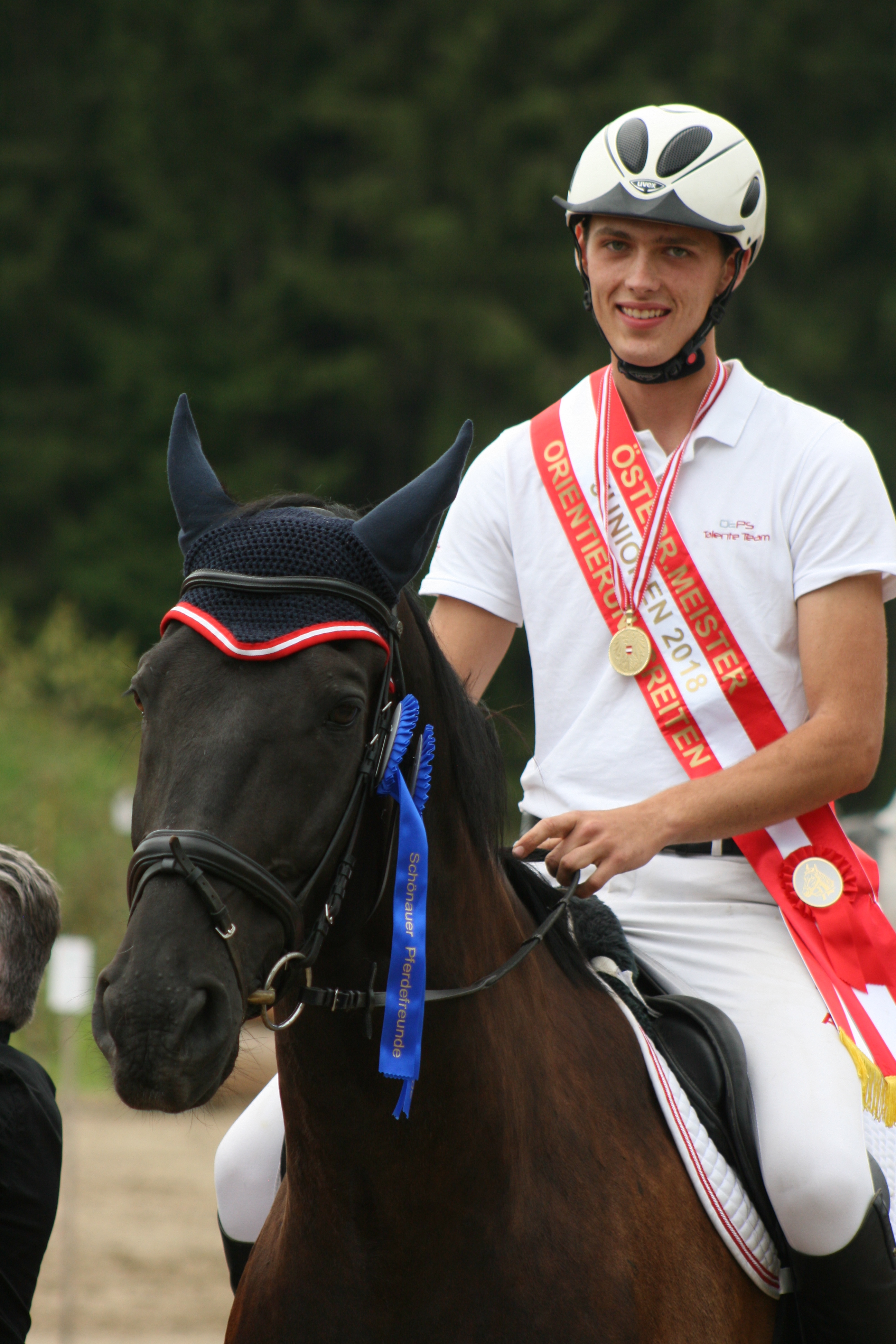 Mit einem 2. Platz in der Gangprüfung (MA) und ebenso dem 2. Rang in der Hindernisstrecke (PTV) sicherte er sich mit seinem 11-jähringen ungarischen Warmblut-Wallach „Ritmus“ den 1. Gesamtrang (393 Pkt.) und wurde damit „Österreichischer Meister der Junioren im Orientierunsgreiten 2018“.