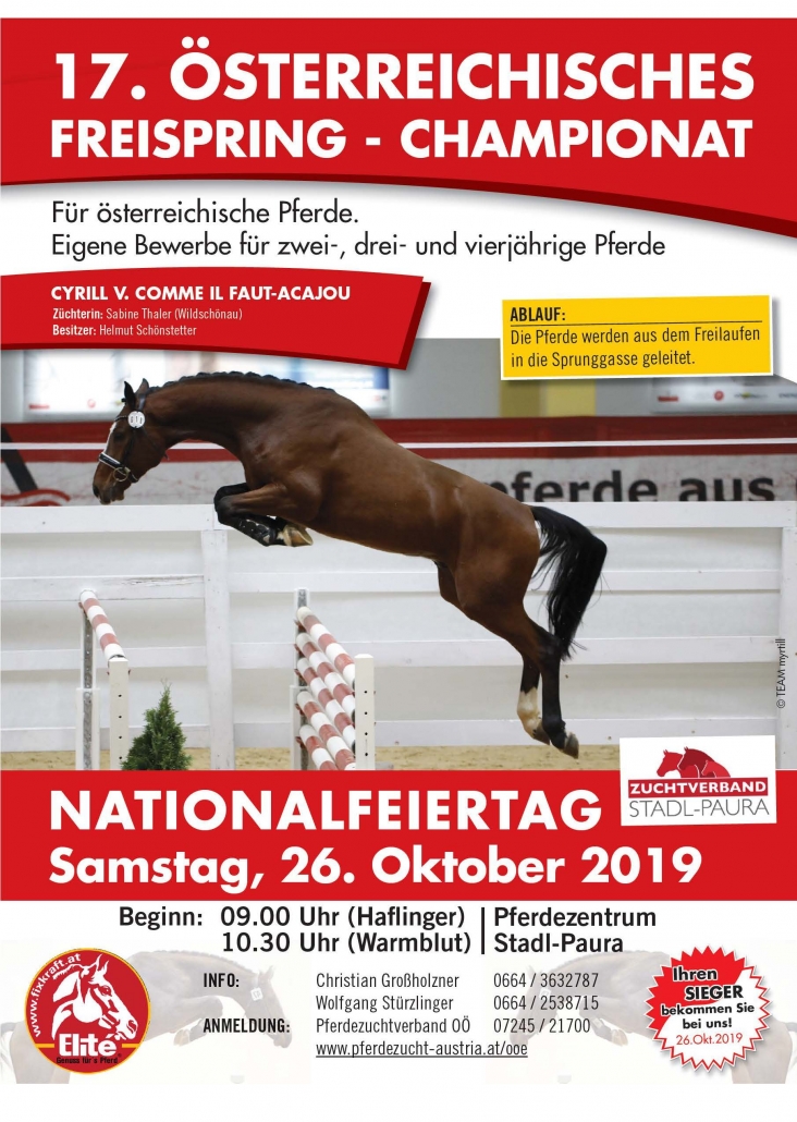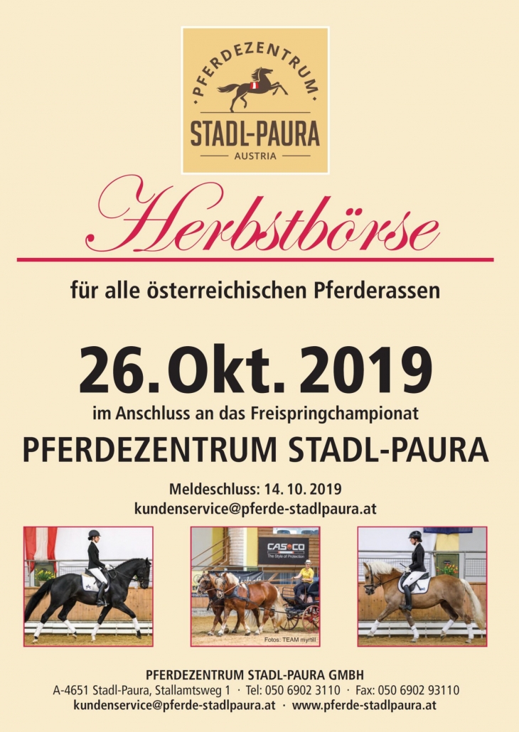 Pressemitteilung – Nach der gelungenen Frühlingsbörse am 01. Mai 2019 findet am 26. Oktober 2019 im Anschluss an das Österr. Freispringchampionat 2019 die Herbstbörse statt. Die Stadlinger Verkaufsveranstaltung ist für alle österreichischen Pferderassen ausgeschrieben. Nennschluß ist der 14. Oktober 2019.