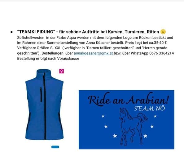 Ein kleines Versprechen zum Schluss: Es gibt bereits einen Entwurf für eine „Teamkleidung“. Einige „Ride an Arabian“ – Gilets wurden bereits bestellt. Sobald diese eingetroffen sind werden Fotos gesandt. Hier jedoch die ersten Entwürfe: