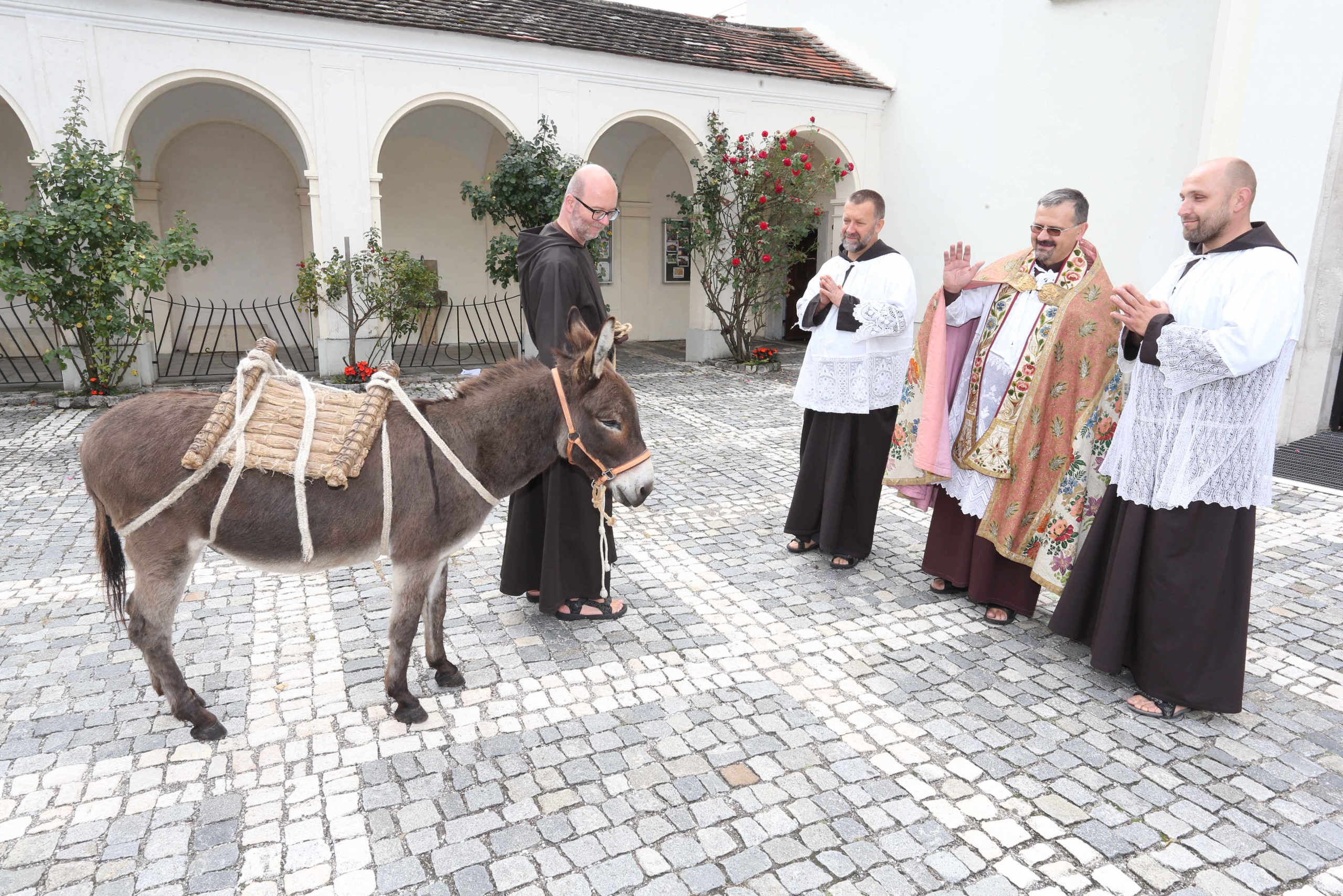 Kapuzinerpater Marek mit seinen Mitbrüdern bei der Eselsegnung im Kapuzinerkloster Wiener Neustadt. © ZVG