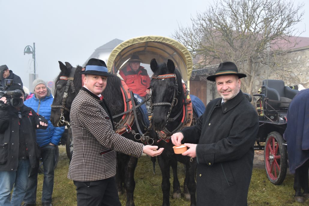 Bundeskulturreferent Otto Kurt Knoll und der Landtagsabgeordnete Josef Balber reichten 2017 beim Stephanie-Ritt gemeinsam gesegnetes Brot und Salz. © NOEPS