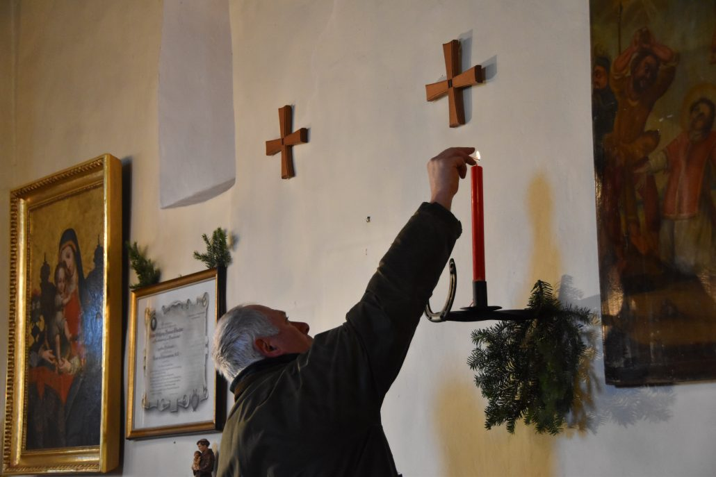 In der Kirche: Entzünden einer roten Kerze vor dem alten Stephanusbild.