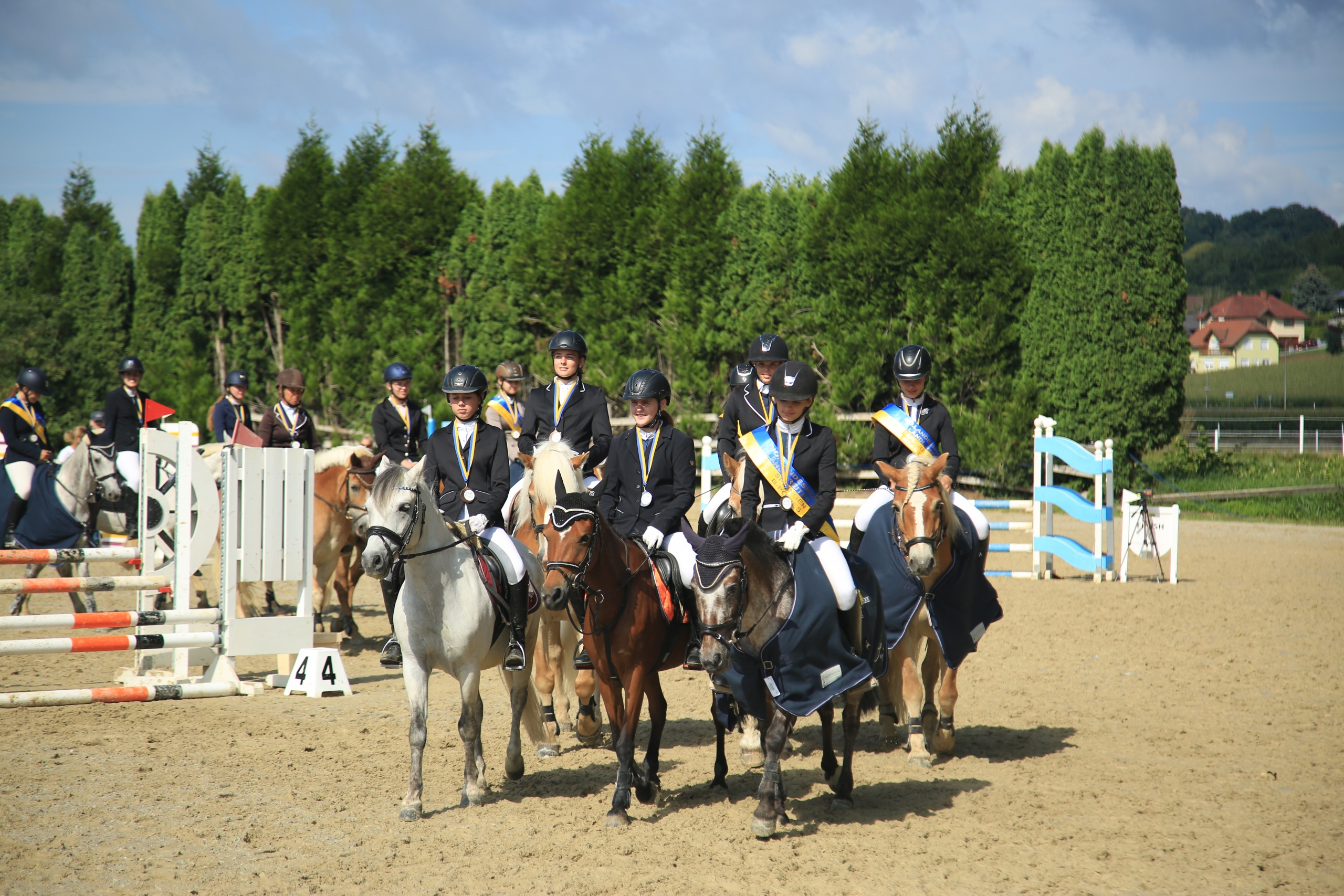 Die Schärpen der Ländlichen Landesmeister Springen in 5 Pony- und Haflingerklassen gewannen Magdalena Zellhofer (B-Pony), Christa Doupovec (Haflinger linzenzfrei), Lisa Pribil-Sumetsberger (Haflinger mit Lizenz), Amelie Bitzan (Pony Jugend) und Johanna Berger (Pony Kinder).