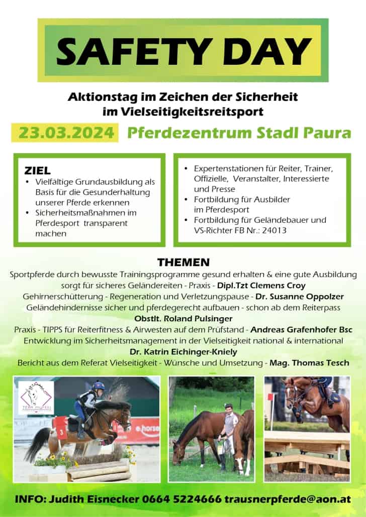 Pferdesport in NÖ (06.02.2024) – Der OOEPS und der OEPS laden am 23.3.2024 im Rahmen vom Safety Day 2024, einem Aktionstag im Zeichen der Sicherheit im Vielseitigkeitsreitsports und im Reitsport, sowie einer Fortbildung für Ausbildner, VS-Richter und Geländebauer, ins Pferdezentrum Stadl Paura.