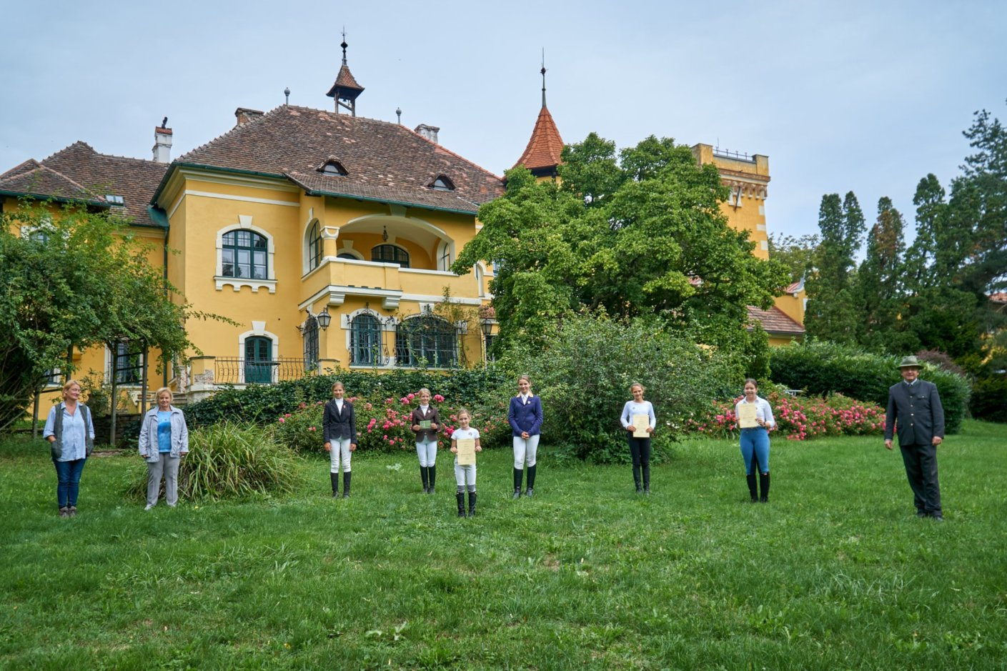 Die Prüflinge bedankten sich bei ihrer Reitlehrerin Ludmila Gräfin Spiegelfeld (Präsidentin des Reit- und Fahrclubs Gut Aichhof) für das Training. Für das nächste Jahr ist konform zum Gutscharakter wiederum eine Sonderprüfung im kleinen Rahmen geplant.