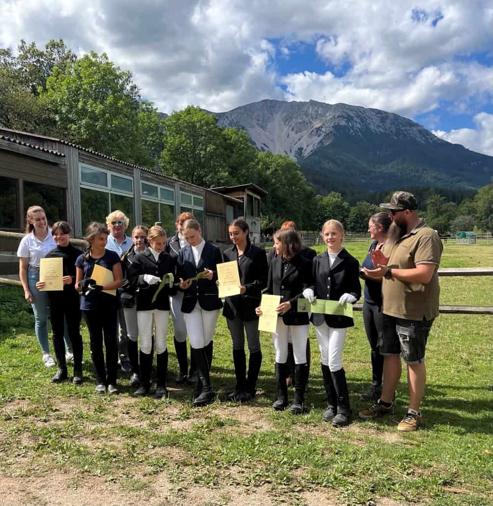 Aus unseren Vereinen | Sonderprüfung Team Sion (04.09.20239 – Am 2.9. fand in Puchberg beim Team Sion eine Sonderprüfung Großes Hufeisen, Reiterpass und Dressur-Reiternadel statt. Bei herrlichem Wetter konnten vor der traumhaften Kulisse des Schneebergs alle elf Kandidatinnen ihre Prüfungen souverän bestehen und ihre Abzeichen von Richterin Ines Bejdl entgegen nehmen.  Wir gratulieren sehr herzlich!