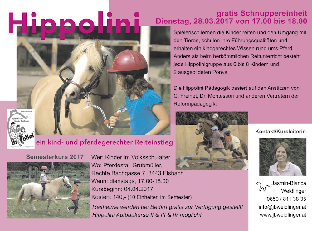 Kurse & Veranstaltungen Hippolini gratis Schnuppereinheit Lade Karte ... Rechte Bachgasse 7 - ElsbachVeranstaltungen 48.2497366 16.04677479999998 Datum 28.03.201717:00–18:00 Veranstaltungsort Pferdestall Grubmüller Rechte Bachgasse 7 3443 Elsbach Österreich