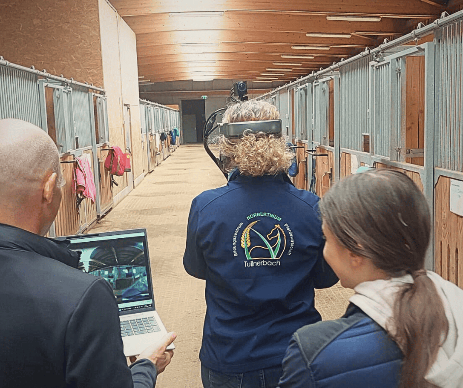 Mithilfe einer speziellen 3D-Pferde-Simulationsbrille bewegst du dich durch einen realen Parcours – vom Stall über die Reithalle bis in den Außenbereich und zum Pferdeanhänger – und nimmst deine Umgebung aus der Sicht des Pferdes wahr.
