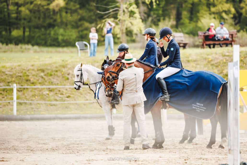 Der Sonntag startete mit der traditionellen Verfassungsprüfung, bei der ein Tierarzt und ein Richter die Fitness der Pferde nach dem anstrengenden Geländetag überprüfen. Erst nach der Freigabe durch die beiden geht es für Pferd und Reiter in den finalen Springparcours. Die Springprüfungen sorgten für einige Veränderungen in den Ergebnislisten. Besonders turbulent ging es im Abschlussspringen der Klasse V105 zu. Dazu kam ein dramatischer Wettersturz just als die letzte Starterin des Turniers einritt und sich orkanartigen Sturmböen gegenübersah. Trotz des Wetterumbruchs ritt Sie ihre Prüfung tapfer zu Ende und konnte noch eine Platzierung erreiten. Die strahlenden, manchmal auch überraschten Sieger*innen und Platzierten setzten mit donnernden Hufen auf den Ehrenrunden ein Zeichen gegen Siegerehrungen ohne Pferd.