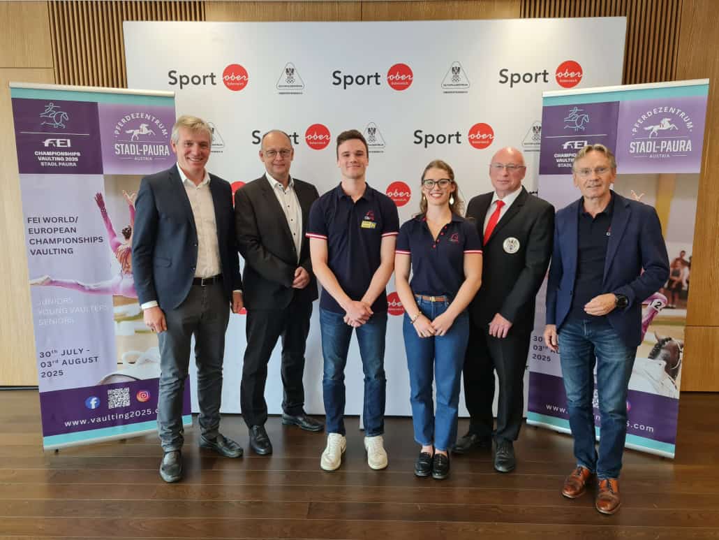 Johannes Mayrhofer (Geschäftsführer Pferdezentrum Stadl Paura), Mag. Christian Kermer (UVG Breitenfurt Veranstalter), Philip Clement (NÖ, Team Wildegg), Anna Weidenauer (NÖ; Team Wildegg), Manfred Rebel (Bundesreferent Voltigieren), Franz Schiefermair (Generalsekretär des OEPS). © Vaulting2025