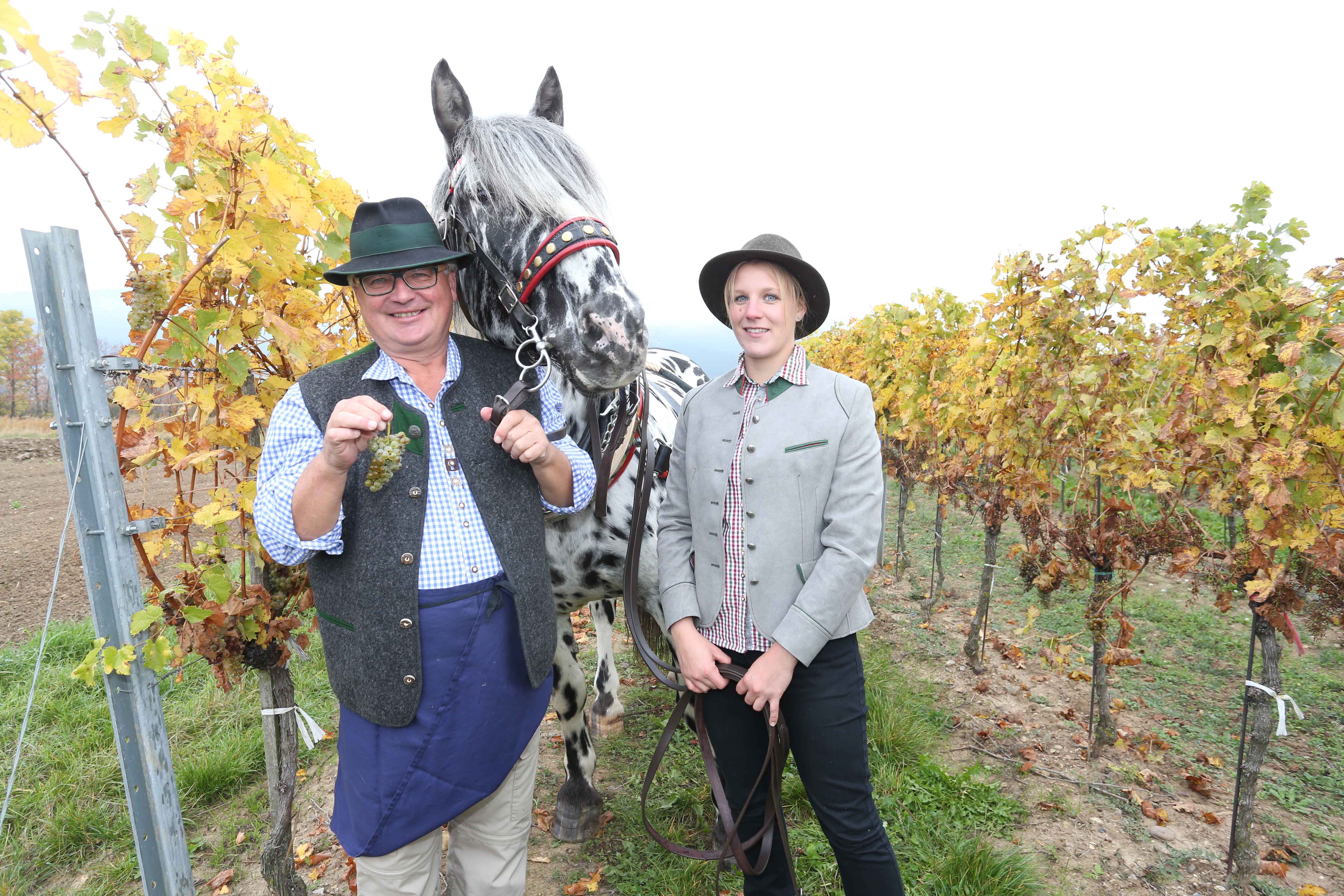 Dr. Maximilian Dobretsberger, Gestütsleiter des Bundesgestüts Piber, und Stefanie Kager mit ihrem Noriker Schwarzflecktiger, im Weingarten in Großau bei Bad Vöslau freuen sich auf die Veranstaltung „Wein und Pferd“ am 8. Jänner 2018 in der Weinbauschule Klosterneuburg © NOEPS
